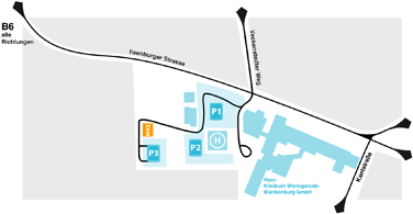 Anfahrt über die Bundesstraße B6n: Abfahrt Wernigerode Nord. Folgen Sie der Ausschilderung Wernigerode Zentrum und biegen Sie an der 2. Verkehrsampel rechts auf den Parkplatz Harz-Klinikum/ Medizinisches Zentrum Harz ab. Folgen Sie der Ausschilderung P3 und nutzen Sie nach ca. 250m die entsprechenen Parkplätze.